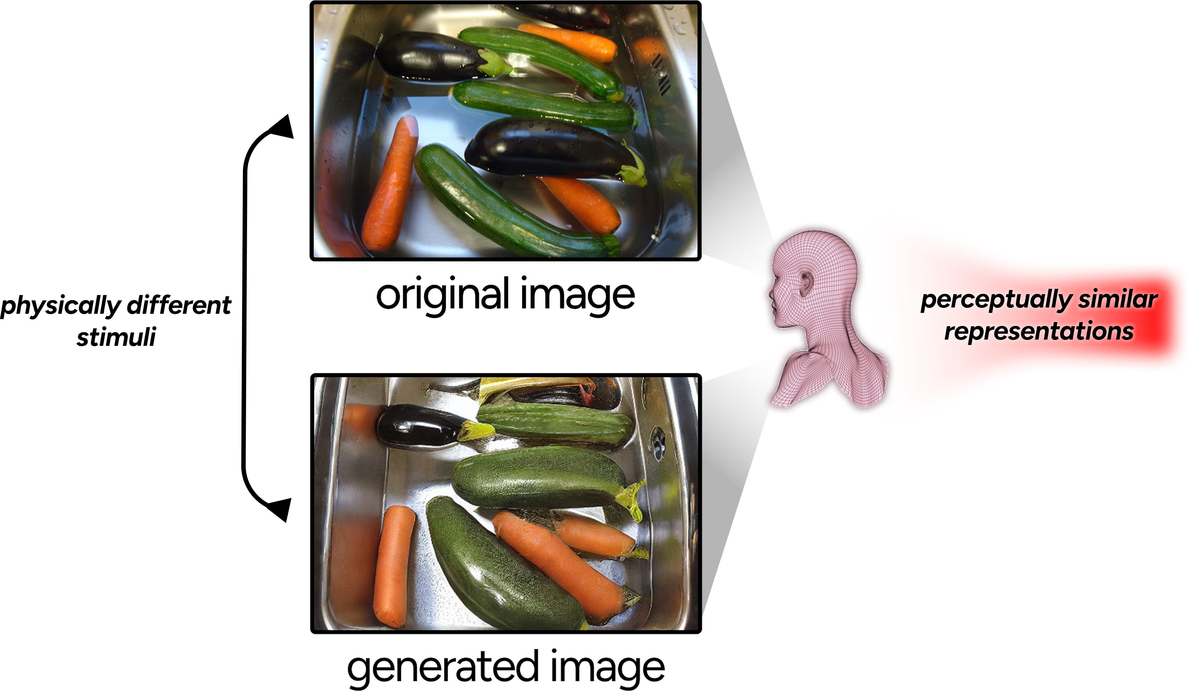 (Left) Original images with randomly-sampled fixations overlaid in red and corresponding generated images judged as "same" by participants.
